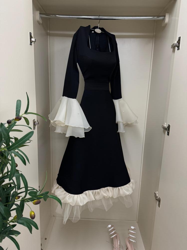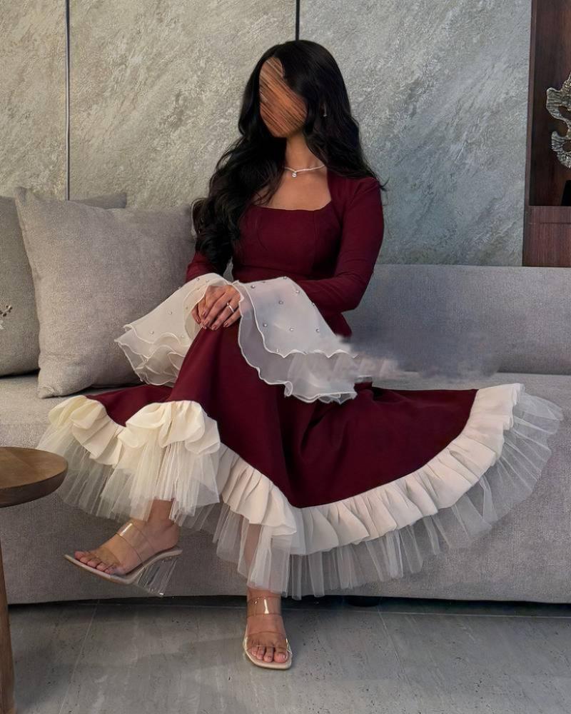 ارتدي الفخامة مع هذا الفستان الساحر بلونه العنابي الملكي، بتصميم أنيق مزين بلمسات من التول الأبيض والكشكش الفاخر. الأكمام المنسدلة بتفاصيلها الرقيقة تضيف لمسة من الرقي، بينما تمنحك التنورة المتطايرة إطلالة حالمة.
